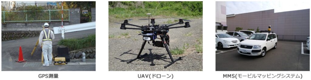 | UAV(ドローン)、MMS(モービルマッピングシステム)、 3Dレーザースキャナーによる三次元測量 |
